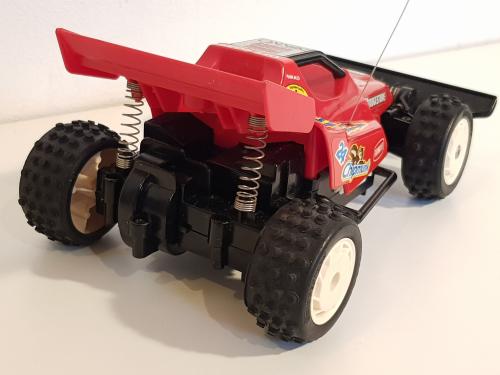 1985 Ik nam dat ding bijna overal mee naartoe. Dit exemplaar is niet de originele uit mijn jeugd want die heb ik helemaal afgereden. Ik kan me ook nog herrinneren dat hij zijn voorbumper verloren was. En de achterbanden...daar zat geen nopje meer op. De zender is heel eenvoudig, vooruit achteruit, links rechts. En proportioneel zat er niet op. Achterin zit een 9volt blok. |